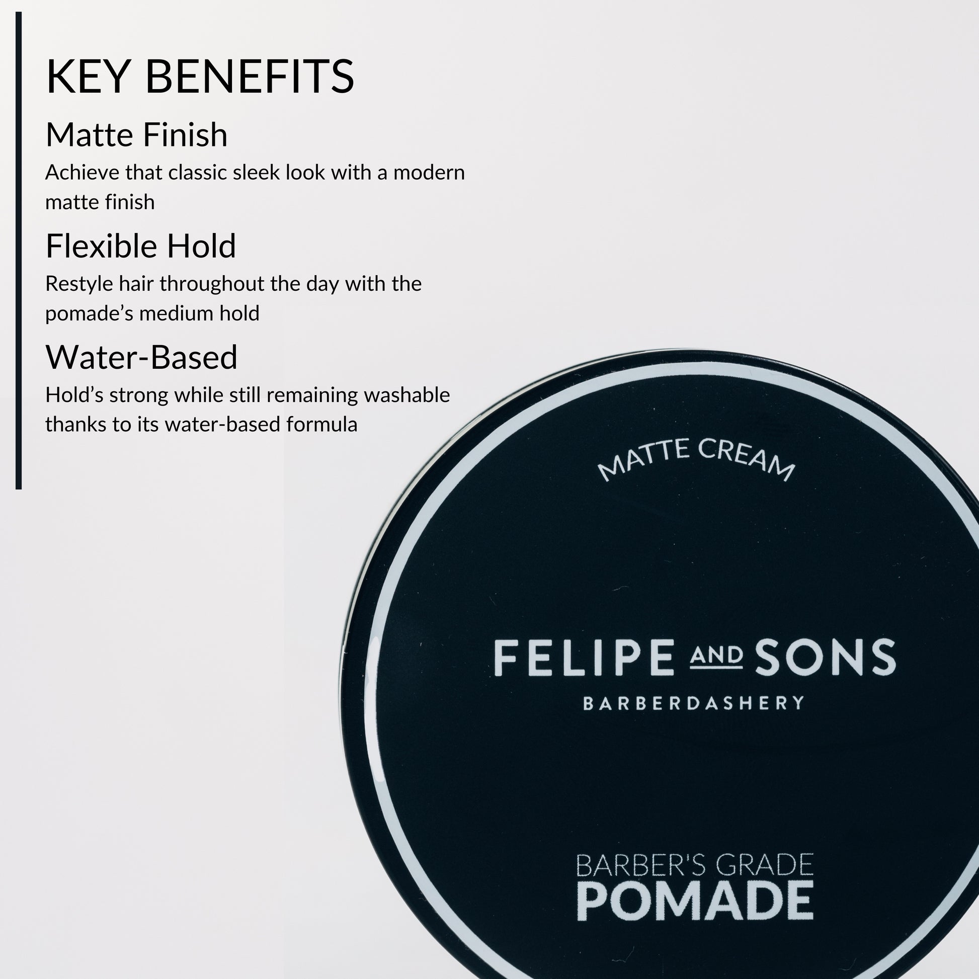 Elevate your hairstyling versatility with Felipe and Sons Barber’s Grade Matte Cream Pomade. Crafted for the modern gentleman, this pomade offers medium hold without the shine, giving you a natural and adaptable look.
